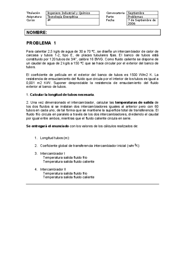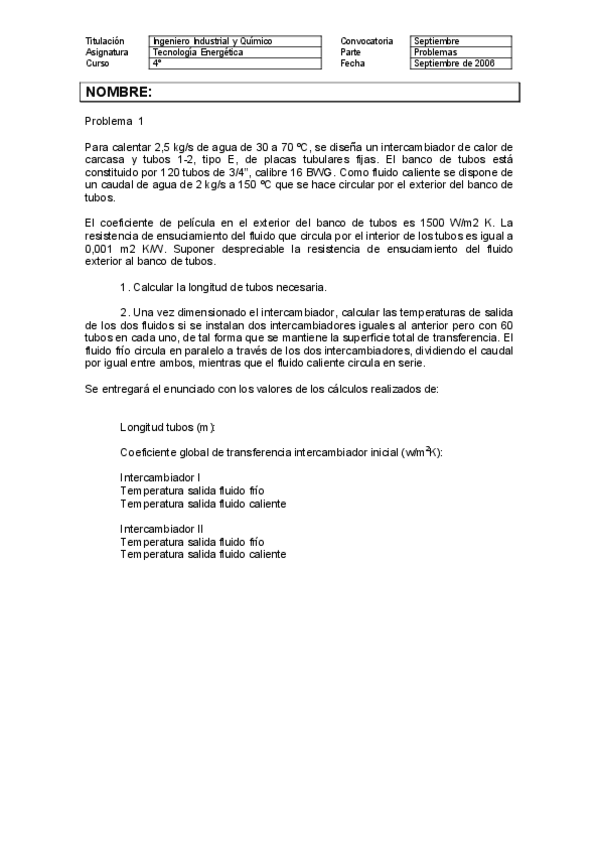 Problemas examen INTERCAMBIADORES