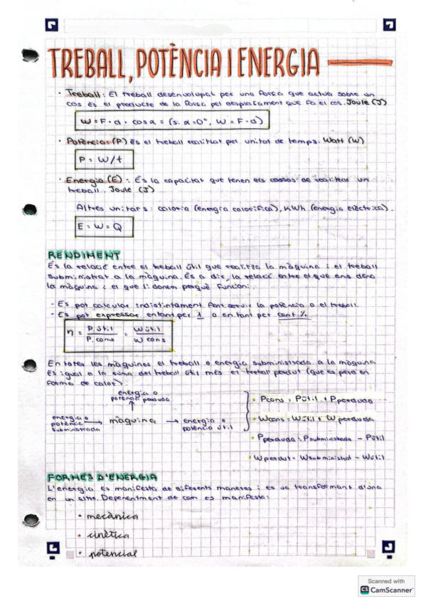Apunts sobre el treball, la potència i l'energia amb les seves clasificacions, característiques i fòrmules respectives. Molt útils.