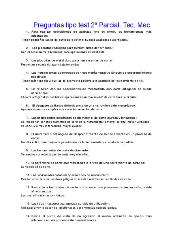 Tests del examen parcial de tecnologia mecanica