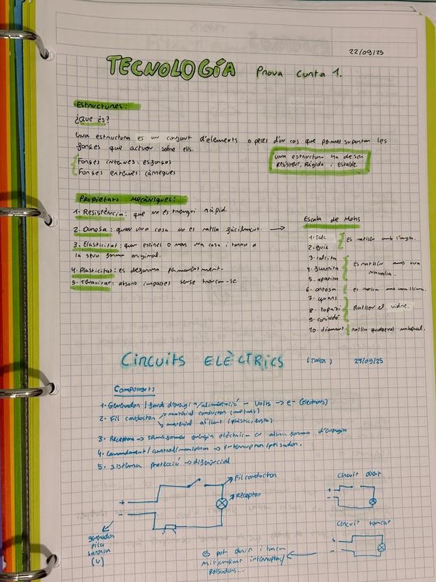 Apuntes resumidos de estructuras, propiedades mecánicas, y la escala de mohs en catalán. También hay un resumen de circuitos eléctricos.