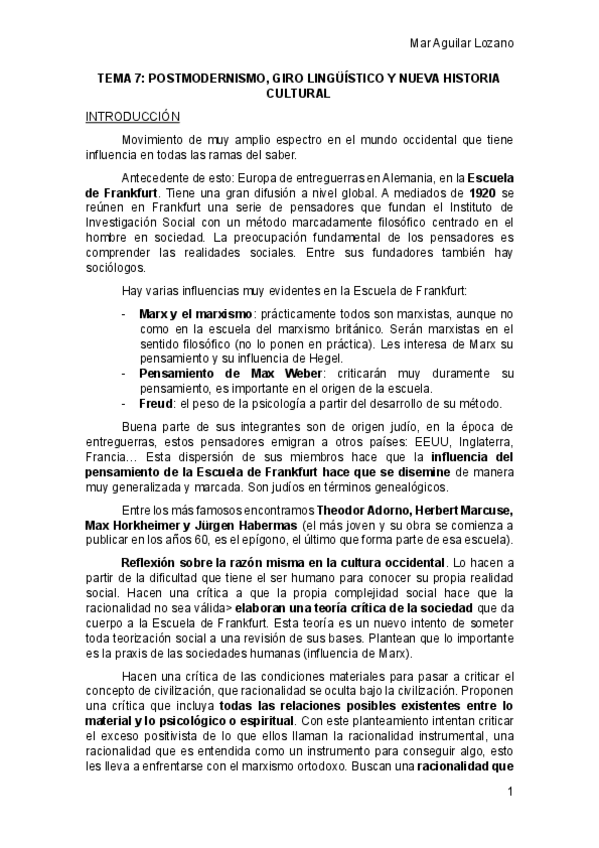 Tema 7 / Escuela de Frankfurt / Giro lingüístico / Microhistoria / Fukuyama