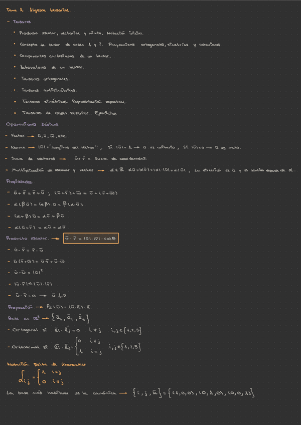 El temario cubierto por el Test 1 corresponde a todo el Tema 1 (Álgebra tensorial), excepto "Tensores ortogonales" y "Tensores simétricos y representación espectral"