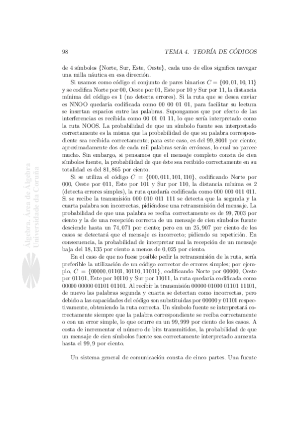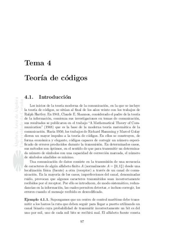 Apuntes de Teoría de Códigos de la Universidad de A coruña. Algunas cosas se explican más claro.