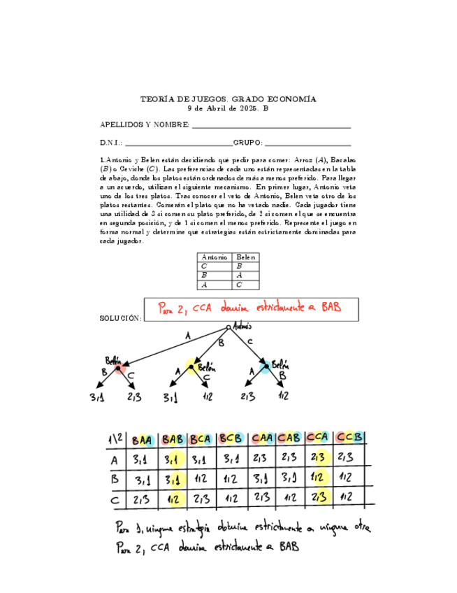 Examen Final de Teoría de Juegos con soluciones cortas, curso 2023/24
