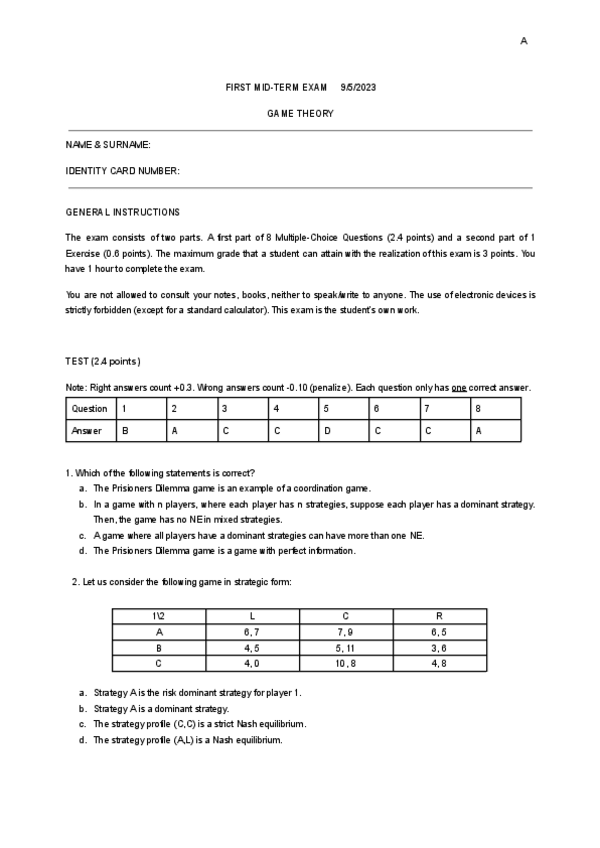 1º Parcial de Teoría de Juegos con soluciones cortas, curso 2023/24