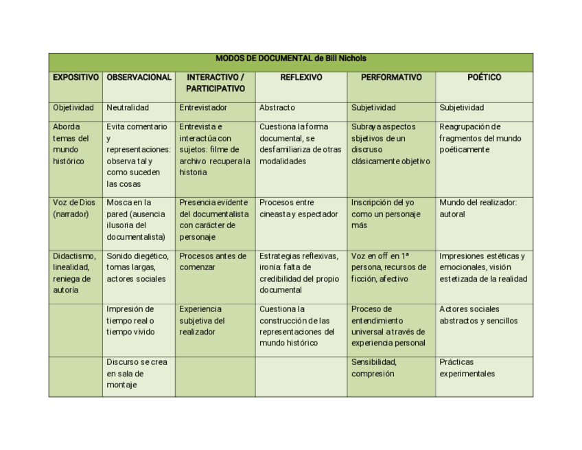 Tabla con los modos documentales de Bill Nichols, todas las características importantes y su comparación entre ellos. Esquema realizado por mi con la información del temario del profesor.