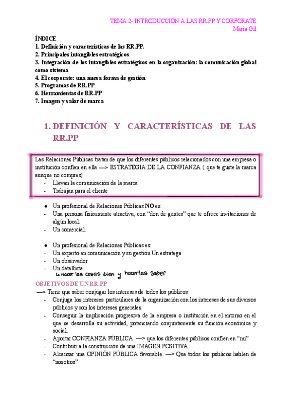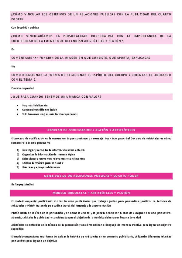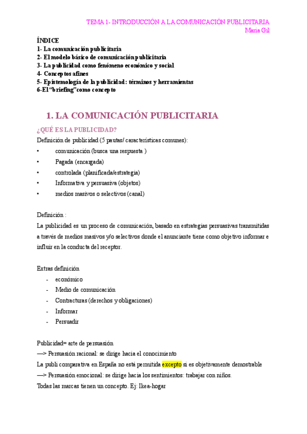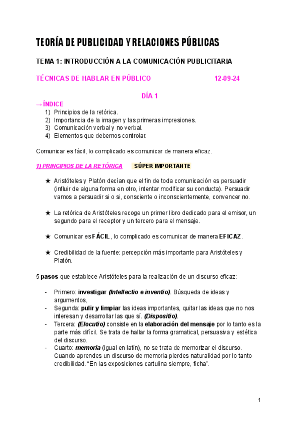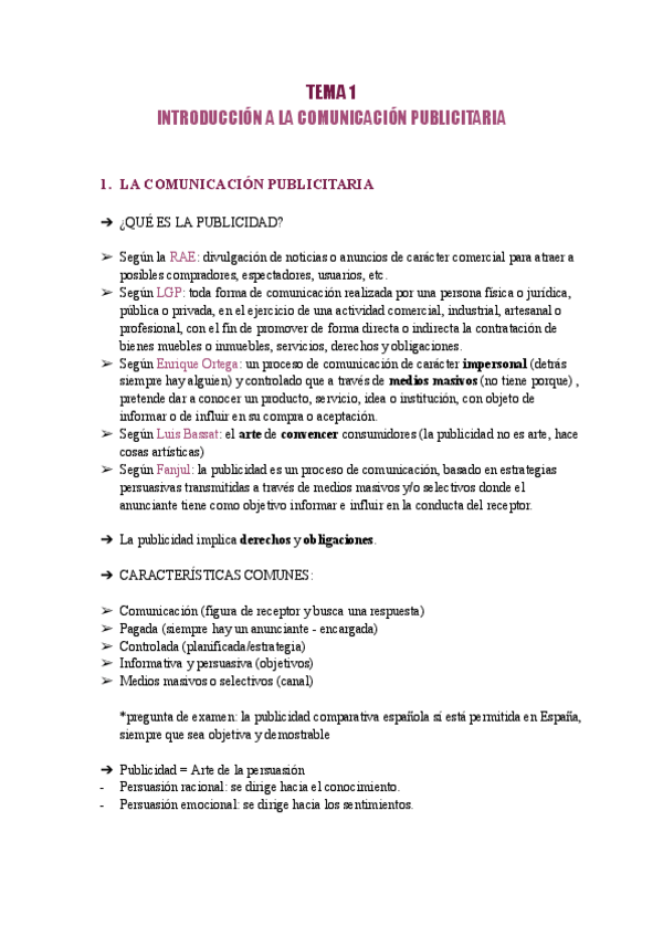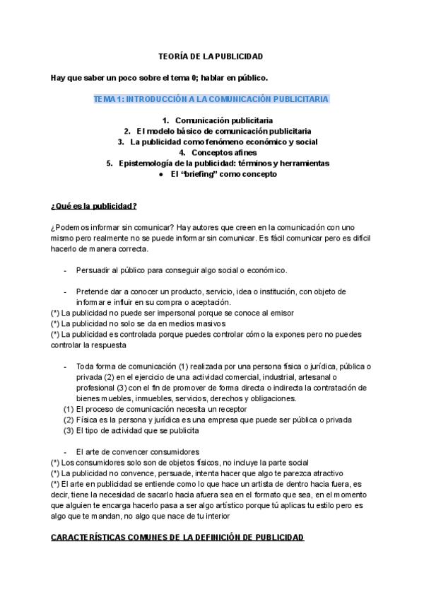 Apuntes de todo el temario de Teoría de la Publicidad y de las Relaciones Públicas. A lo largo del documento hay partes señaladas con colores para diferenciar el temario más importante y el contenido marcado para examen. Hay ejemplos para aclarar dudas.