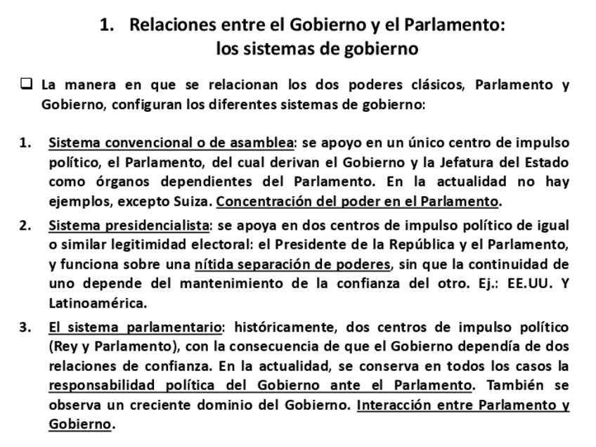 Resumen de la LECCIÓN 13 de la cuota de Tenorio: El Gobierno y sus relaciones con el Parlamento (I): Los sistemas de gobierno (cap. XXI de Democracia de Partidos).