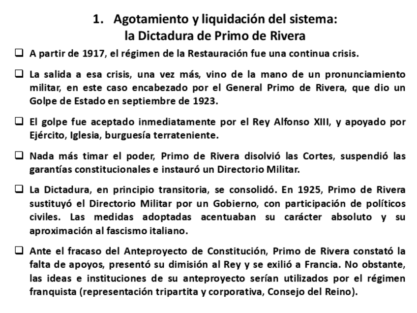 Resumen de la LECCIÓN 18: Restauración de la Monarquía y Constitución de 1876. Dictadura de Primo de Rivera. (Cap V CHE)