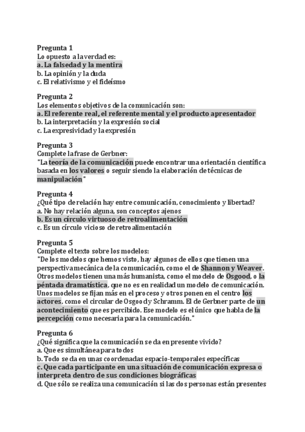 Preguntas tipo test de historia de la comunicación para el examen del 10 de diciembre. Respuesta en negrita y subrayada de gris.