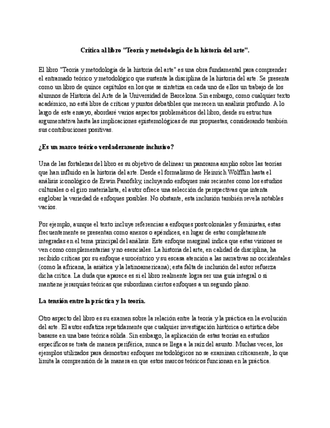 Crítica al libro "Teoría y metodología de la historia del arte" como trabajo de 1º. El profesor es Daniel Quesada Morales.