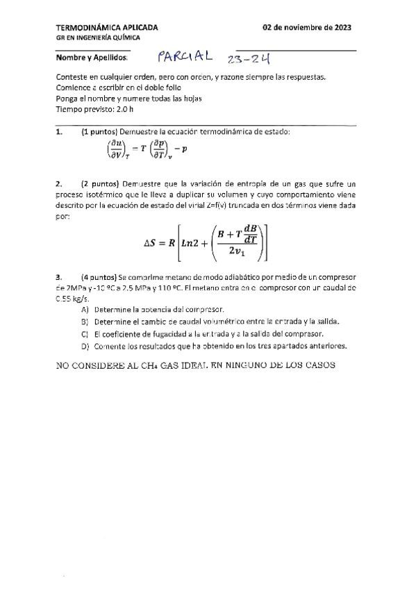 RELACIONES TERMODINAMICAS, PROPIEDADES RESIDUALES Y SISTEMAS ABIERTOS 2023-2024
