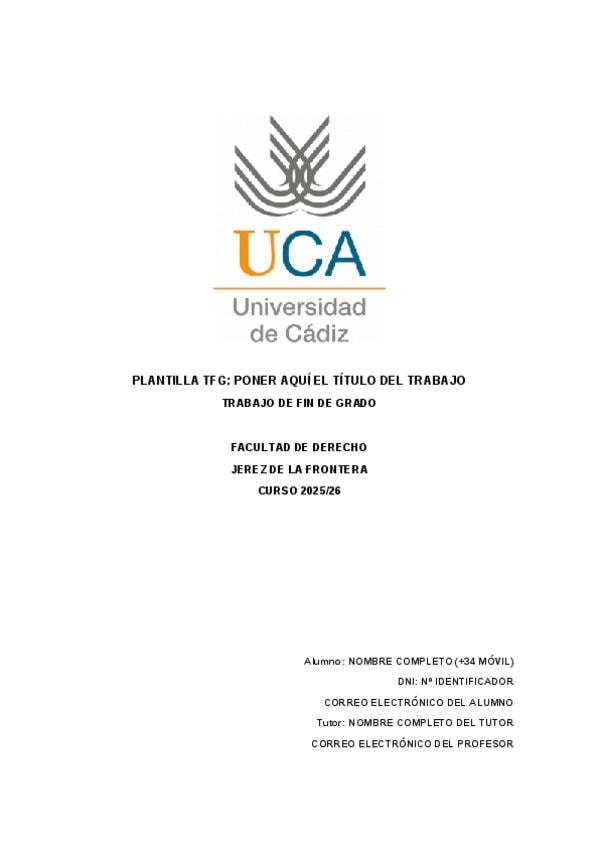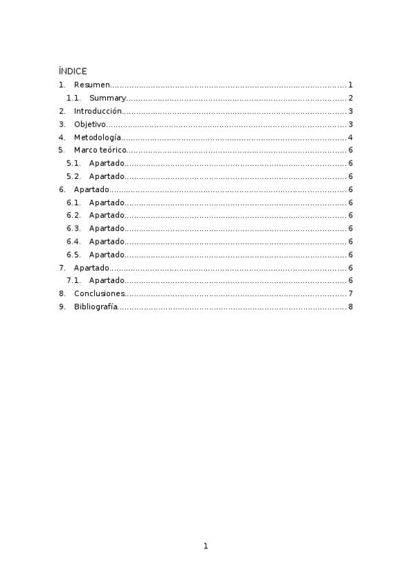 Plantilla creada con portada e índice paginado, perfecto para rellenar con tu contenido. Incluye también objetivo y metodología, a modificar con el contenido del TFG en cuestión que se vaya a realizar.