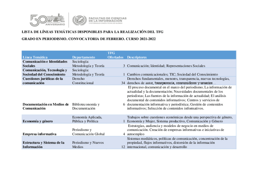 He publicado nuevos otros de 4º Trabajo Fin de Grado: LISTA-DE-LINEAS-TEMATICAS-TFG-PERIODISMO-CONVOCATORIA-DE-FEBRERO-CURSO-2021-2022.pdf