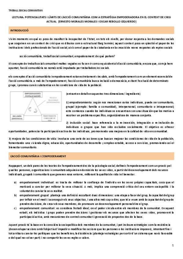 resum lectura POTENCIALITATS I LÍMITS DE L’ACCIÓ COMUNITÀRIA COM A ESTRATÈGIA EMPODERADORA EN EL CONTEXT DE CRISI ACTUAL