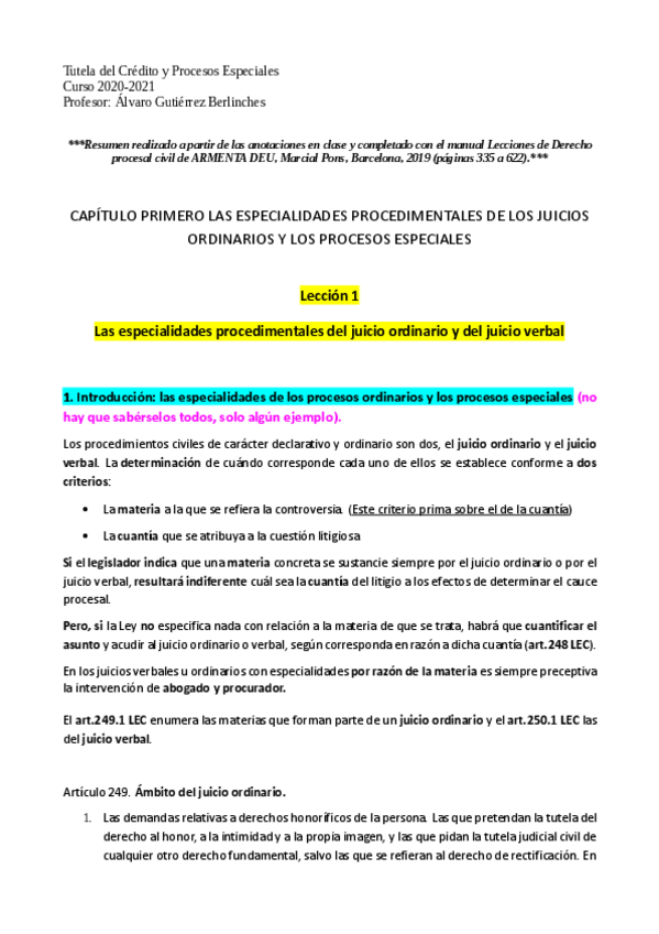 Resumen de apuntes clase + manual Lecciones de D.procesal civil de ARMENTA DEU