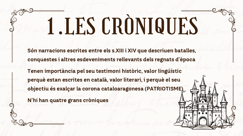 Bernat desclot, Jaume I, Ramon Muntaner, Pere el Cerimoniós i la lírica trobadoresca. Són apunts que vaig agafar a classe i després, vaig fer-ho bonic a un canva.