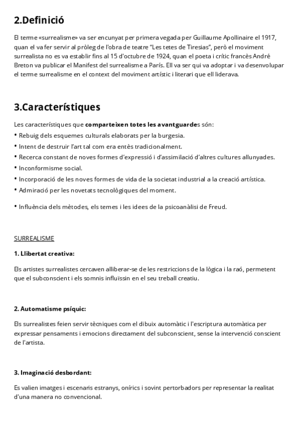 Apunts complets en valencià de 4t ESO Valencià sobre el Surrealisme. Inclou context històric, definició, característiques, André Breton, el Manifest Surrealista, Sigmund Freud i la psicoanàlisi, així com la relació del surrealisme amb la psicologia i la c