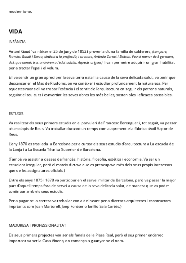 Apunts i material d’estudi sobre el modernisme català i valencià. Inclou informació sobre Gaudí, Domènech i Montaner, Puig i Cadafalch, així com obres clau i característiques arquitectòniques. Finalitza amb preguntes tipus ABC per repassar. Espero que sig