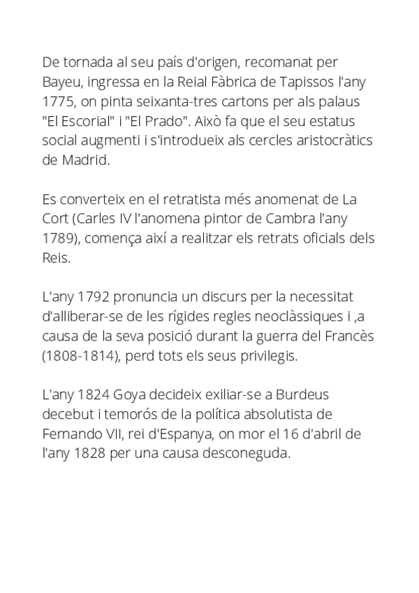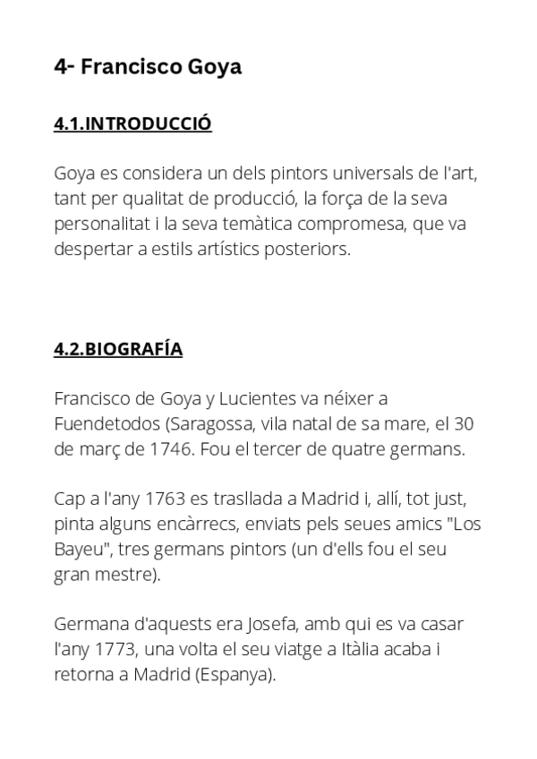 Apunts complets sobre Francisco de Goya. Inclou una introducció, la seua biografia, l’estudi de la seua tècnica pictòrica, l’evolució artística des dels primers encàrrecs fins a les Pintures Negres, i l’anàlisi detallada d’una de les seues obres més impor