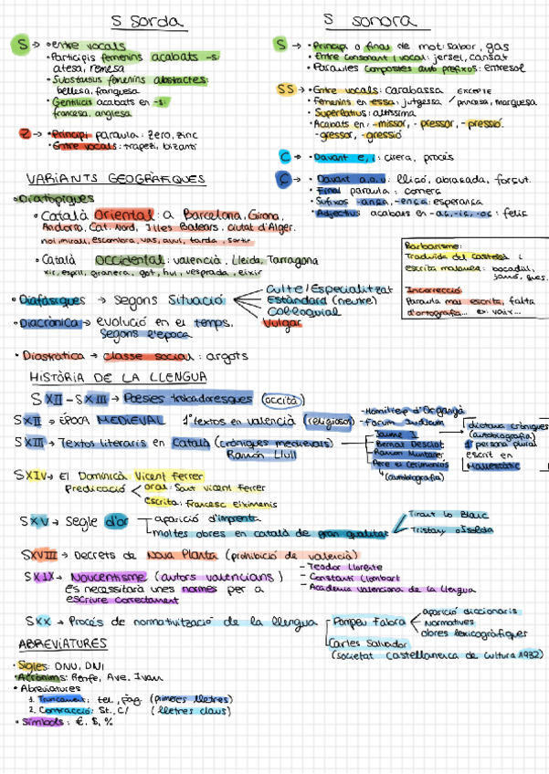 Resum - s sorda i s sonora + exemples - variants geogràfiques - història de la llengua - abreviatures