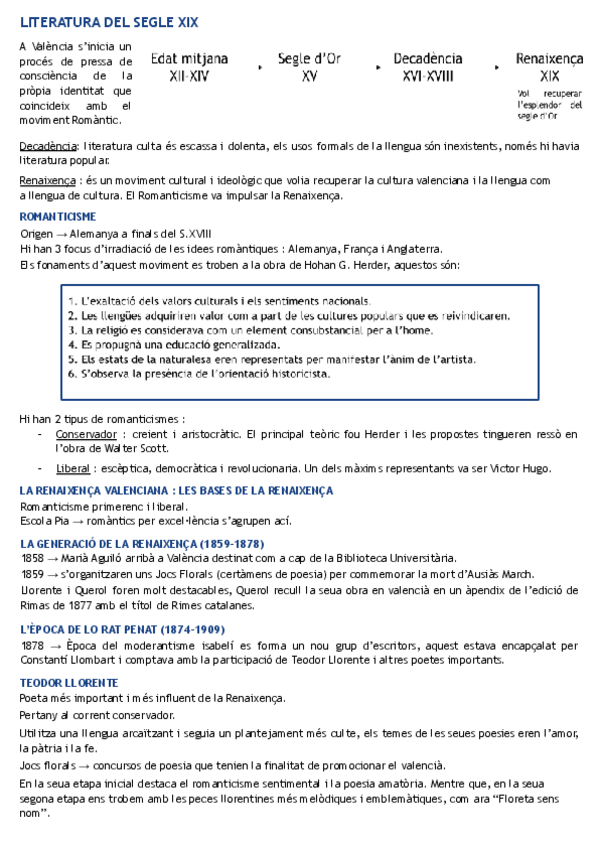 Apunts complets en valencià sobre el Romanticisme i la Renaixença. Inclou introducció i context històric, característiques generals del moviment romàntic, literatura romàntica i la Renaixença amb els seus principals gèneres: poesia, teatre i narrativa. Ta