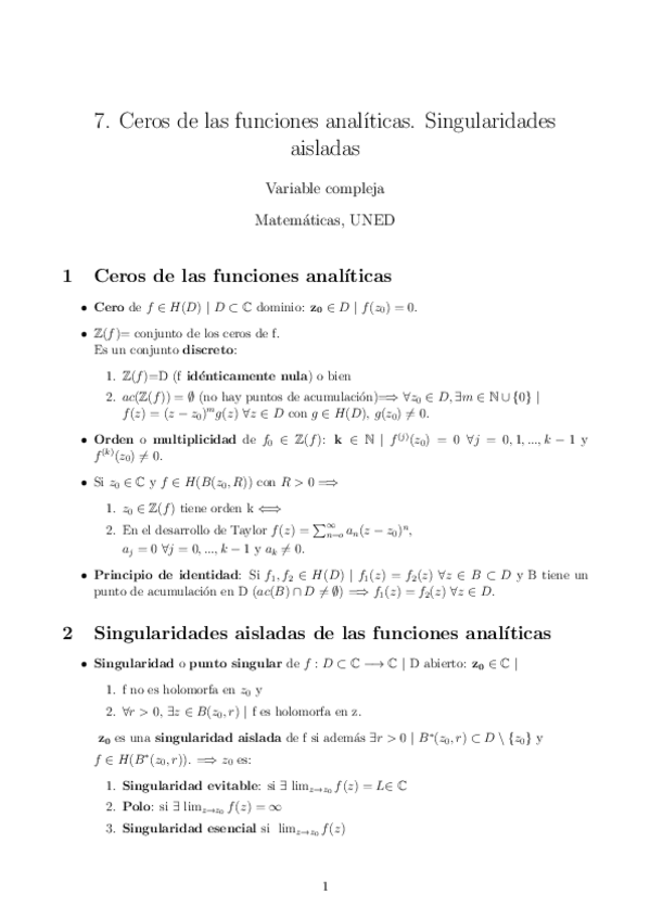 He publicado nuevos apuntes de 2º Variable Compleja: 7. CEROS DE LAS FUNCIONES ANALÍTICAS. SINGULARIDADES AISLADAS.pdf