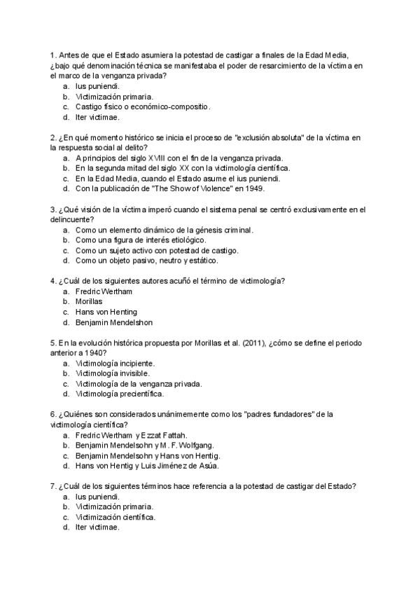 EXAMEN TEST VICTIMOLOGÍA CON PREGUNTAS ESTUDIADAS Y BASADAS EN EXÁMENES ANTERIORES Q CAEN SI O SI