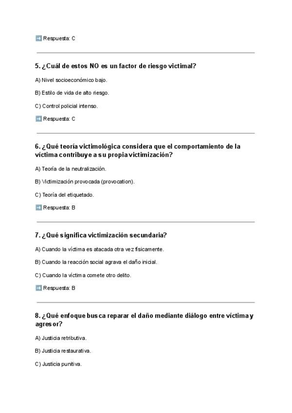 EXAMEN TEST VICTIMOLOGÍA CON PREGUNTAS ESTUDIADAS Y BASADAS EN EXÁMENES ANTERIORES Q CAEN SI O SI