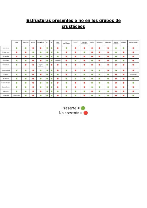Tabla resumen que indica que grupos de crustáceos presentan que estructuras y cuales no