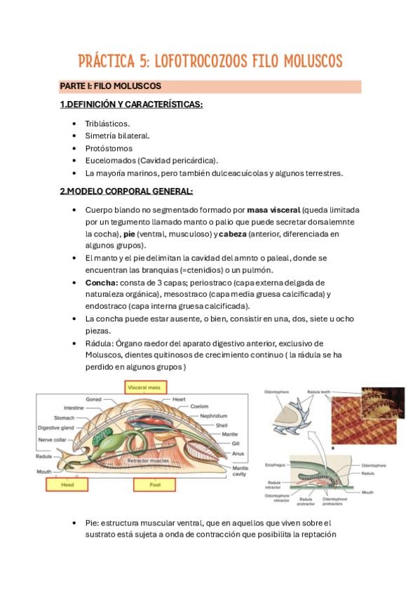 tabla con las principales estructuras de los moluscos con imágenes, descripciones y funciones