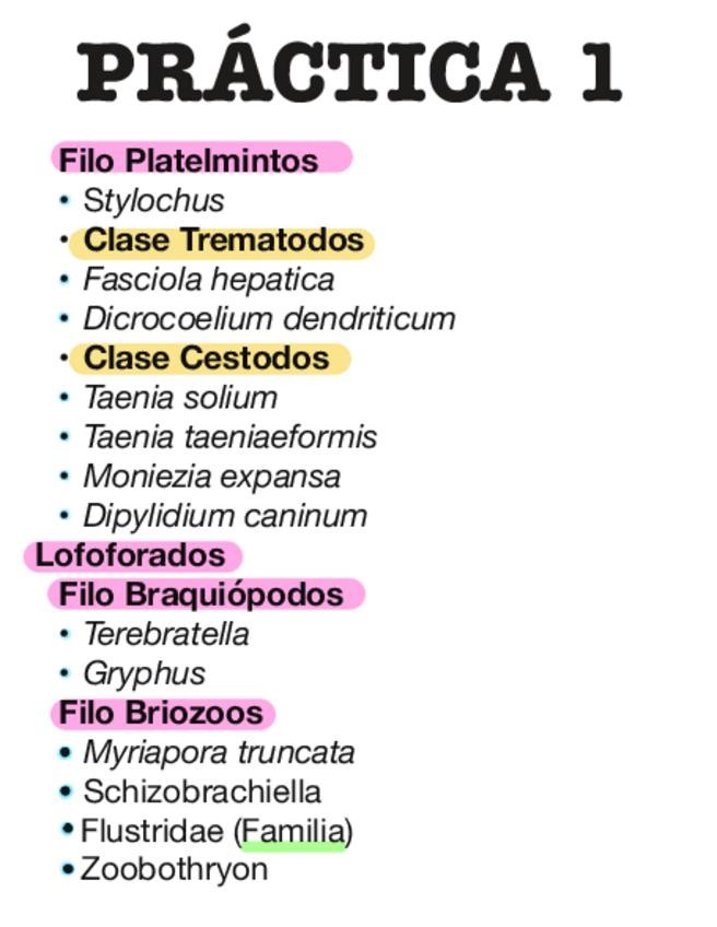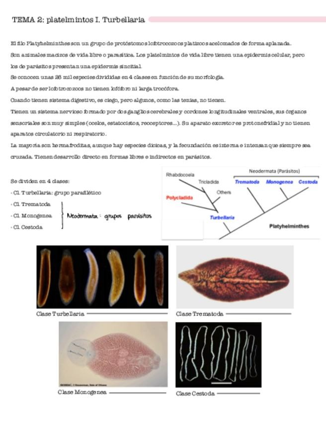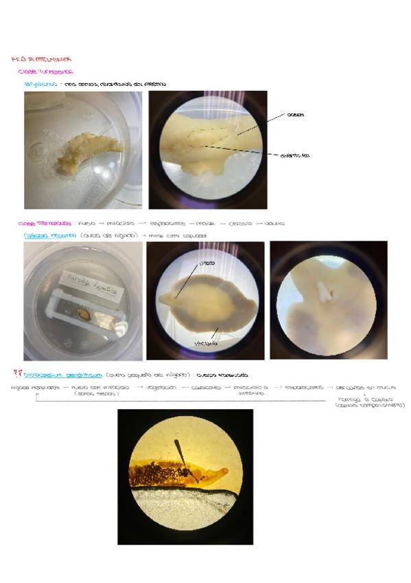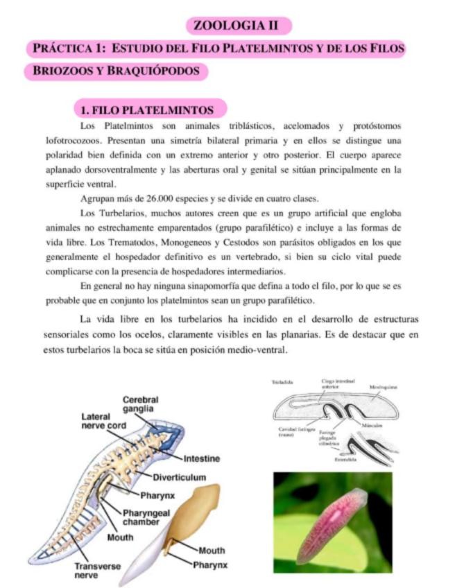 Practica 1 de zoología II, filo platelmintos y lofoforados. Con imágenes estructuras y explicación de los ciclos vitales.