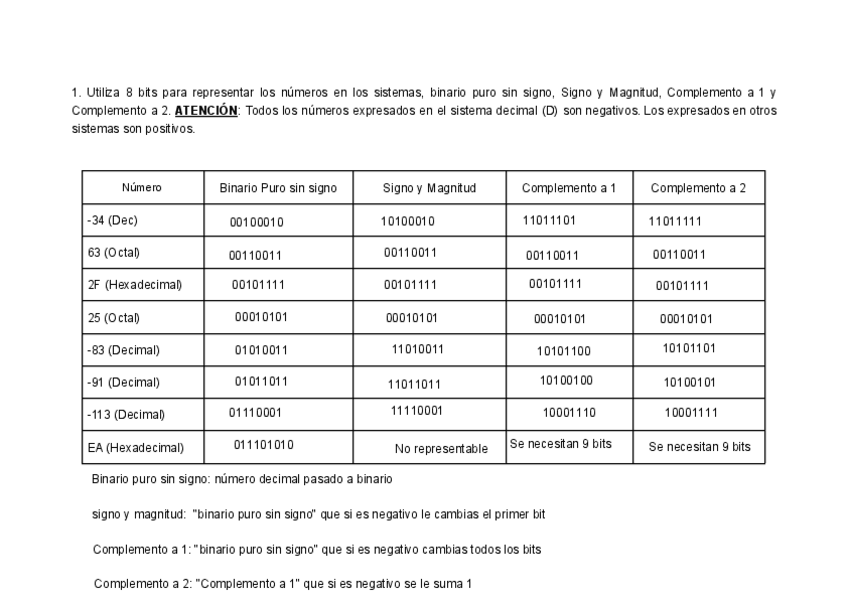 Binario Puro, sin signo, Signo y Magnitud, Complemento a 1, Complemento a 2. BCD Desempaquetado y BCD Empaquetado
