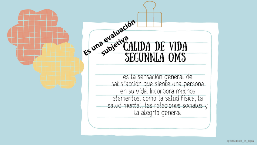 Calidad de vida: OMS*FACTORES QUE AFECTAN*CONDICIONES SOCIALES Y ECONOMICAS*SALUD FISICA MENTAL Y EMOCIONAL*APOYO Y TRATAMIENTO*WHOQOL-BREF*WHOQOL-100*DIMENCIONES*INGRESOS EDUCACION Y EMPLEO*MEDIOAMBIENTALES*INSTRUMENTOS DE MEDICION