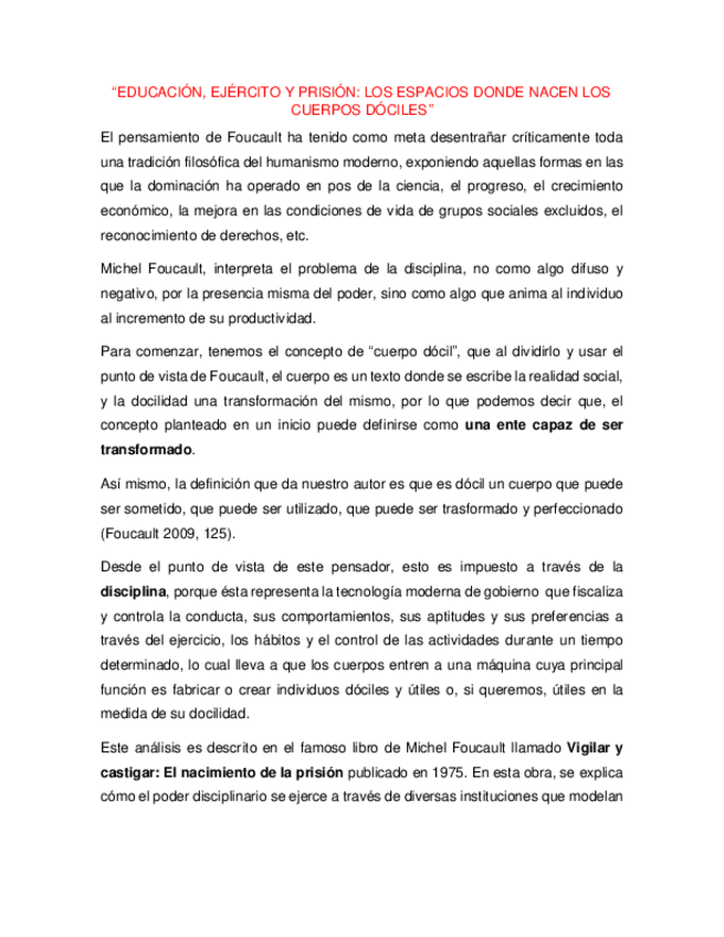 Ensayo sobre el concepto de cuerpos dóciles de acuerdo con Michel Foucault, en el que se usan la escuela, el ejército y la prisión para una mejor ejemplificación