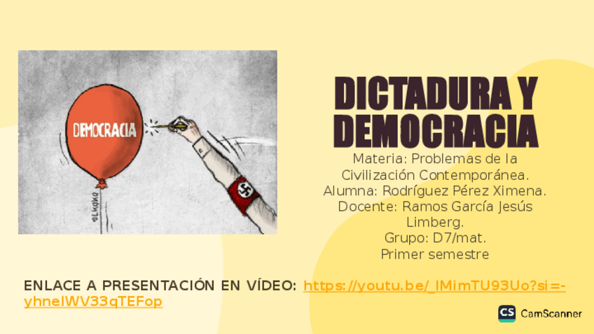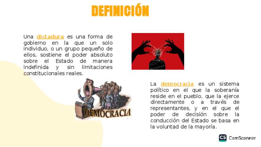 Diapositivas que presentan una comparación entre éstas dos formas de gobierno, aunque se enfoca más en la dictadura