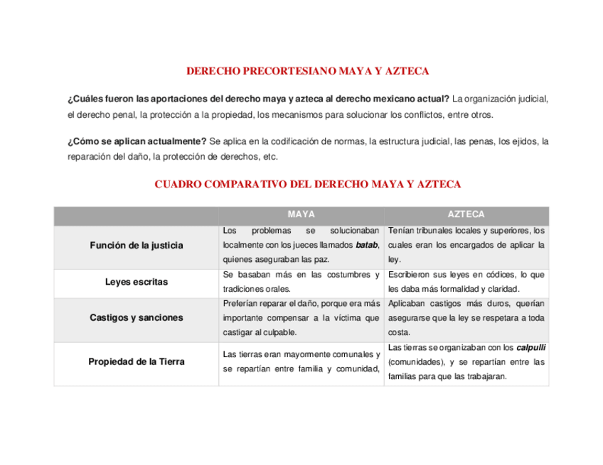 Cuadro comparativo entre el derecho maya y azteca. Contiene aportaciones que ambas civilizaciones hicieron al derecho actual y cómo se aplican en la actualidad