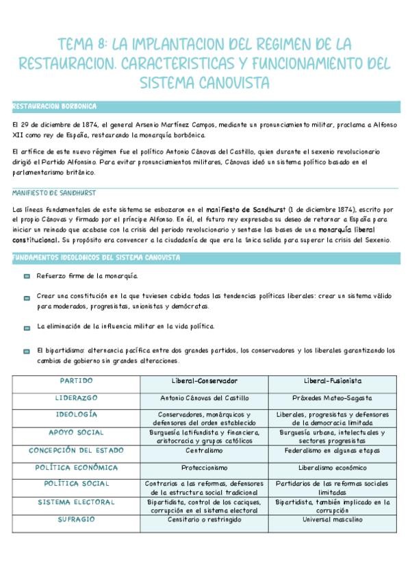 TEMA 8: LA IMPLANTACION DEL REGIMEN DE LA RESTAURACION. CARACTERISTICAS Y FUNCIONAMIENTO DEL SISTEMA CANOVISTA
