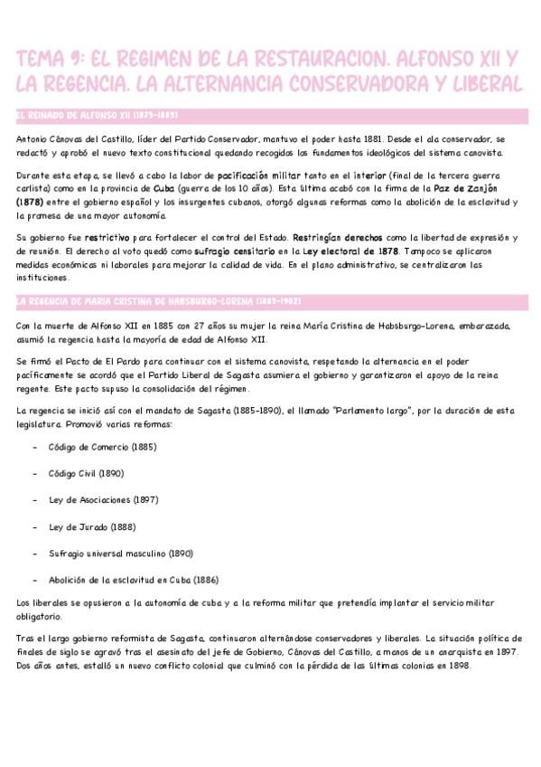 TEMA 9: EL REGIMEN DE LA RESTAURACION. ALFONSO XII Y LA REGENCIA. LA ALTERNANCIA CONSERVADORA Y LIBERAL