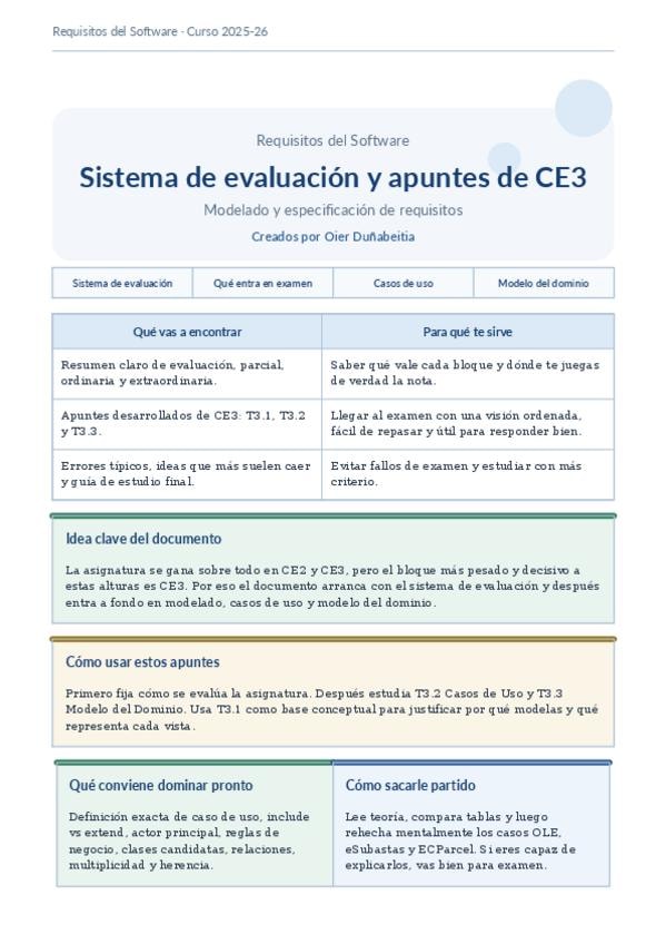 Apuntes completos y muy bien organizados del CE3 de Requisitos del Software. Incluyen sistema de evaluación de la asignatura, modelado de software, UML, casos de uso, relaciones include/extend, documentación de casos de uso, reglas de negocio, rastreabili