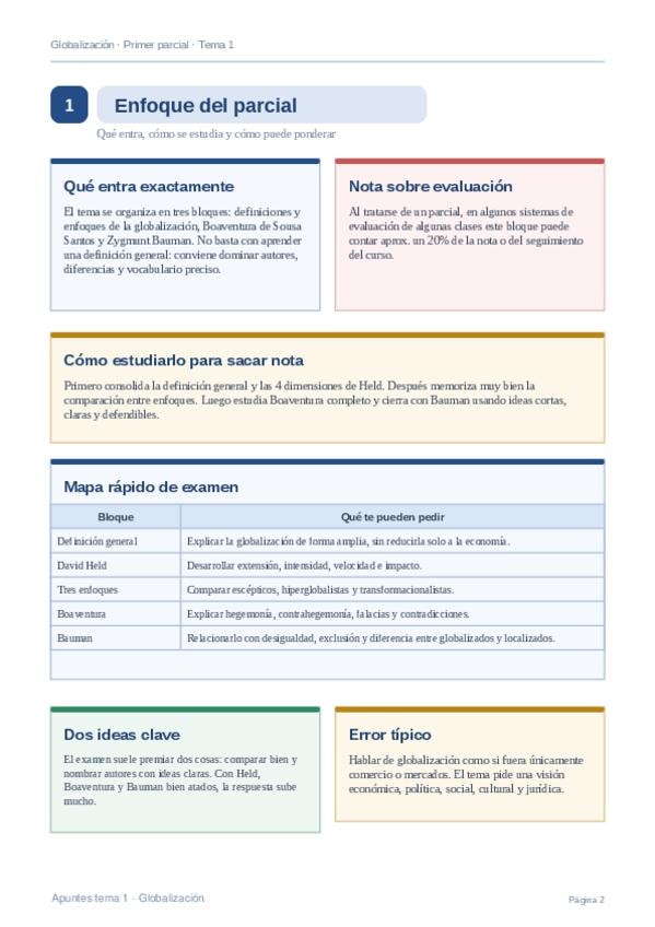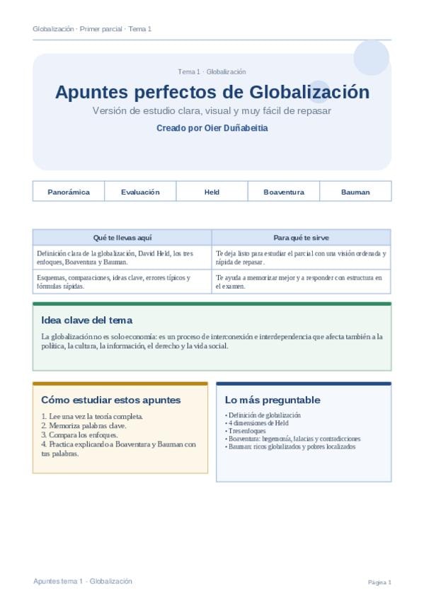 Apuntes claros y bien estructurados del Tema 1 de Globalización para estudiar el primer parcial. Incluye definición de globalización, David Held y sus 4 dimensiones, diferencias entre escépticos, hiperglobalistas y transformacionalistas, Boaventura de Sou