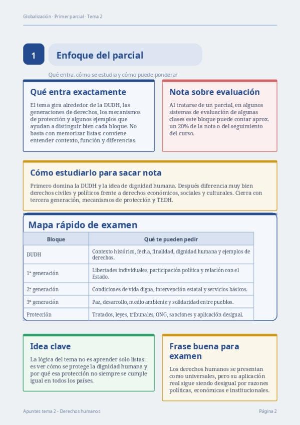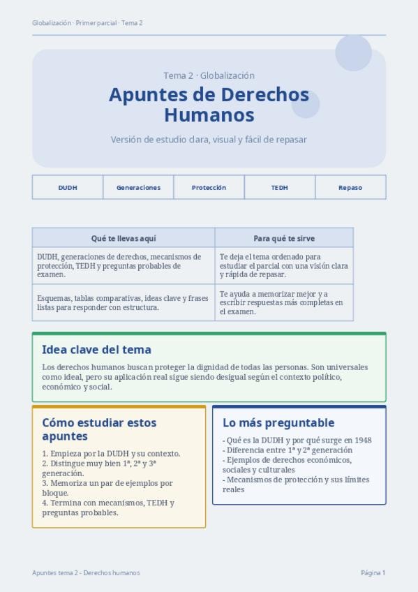Apuntes completos del Tema 2 sobre Derechos Humanos para preparar el primer parcial. Resume generaciones de derechos humanos, diferencias entre primera y segunda generación, tercera y posible cuarta generación, ejemplos típicos de examen y mecanismos de p