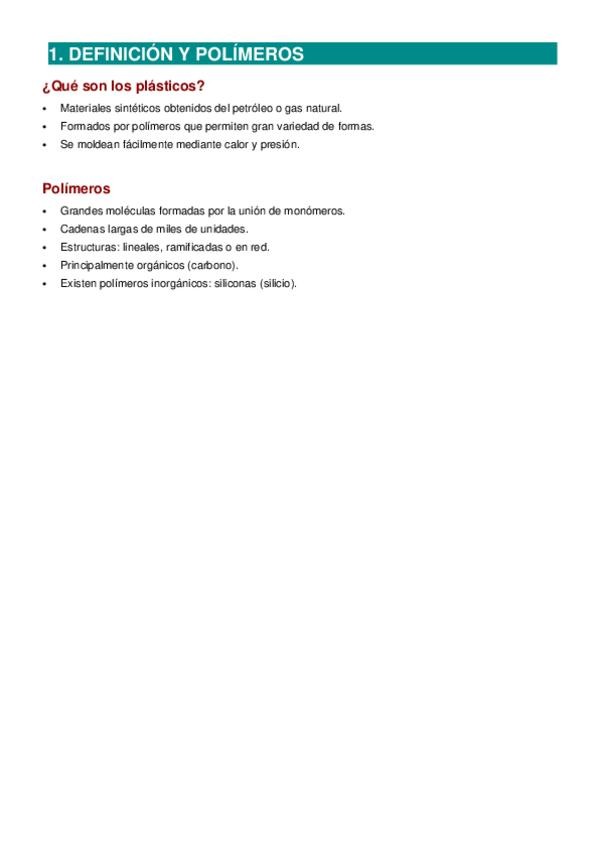 Apuntes resumidos con toda la información necesaria sobre los plásticos y los polímeros.