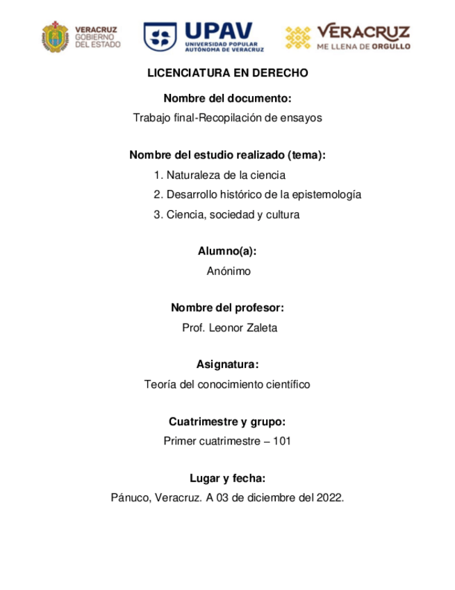 Es una recopilación de información en ensayos sobre los temas 1. Naturaleza de la ciencia 2. Desarrollo histórico de la epistemología 3. Ciencia, sociedad y cultura