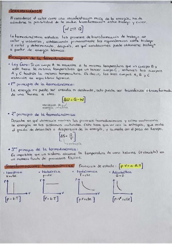 Principios de la termodinámica, motores térmicos, ciclo de Carnot y formulario (energía, trabajo, potencia, rendimiento).