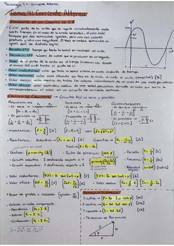 Elementos de un circuito de CA, formulario para el cálculo de circuitos RLC en serie y paralelo, y diferencias entre la corriente continua (CC) y la corriente alterna (CA).