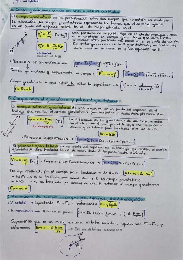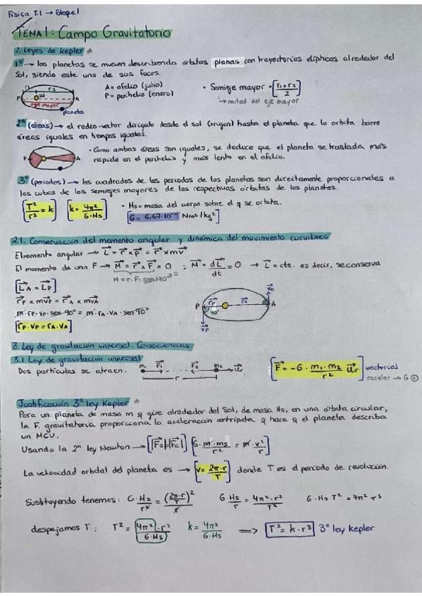 Leyes de Kepler, conservación del momento angular, Ley de gravitación universal, campo gravitatorio, energía potencial gravitatoria, potencial gravitatorio, escape del campo gravitatorio terrestre y satélites.