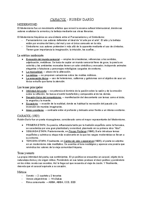 Modernismo, etapas de Rubén Darío, tema y asunto de "Caracol" y métrica del poema.