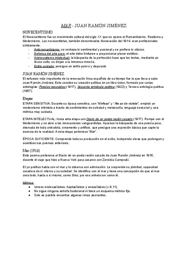 Novecentismo, etapas de Juan Ramón Jiménez, y contexto, tema y métrica de "Mar".