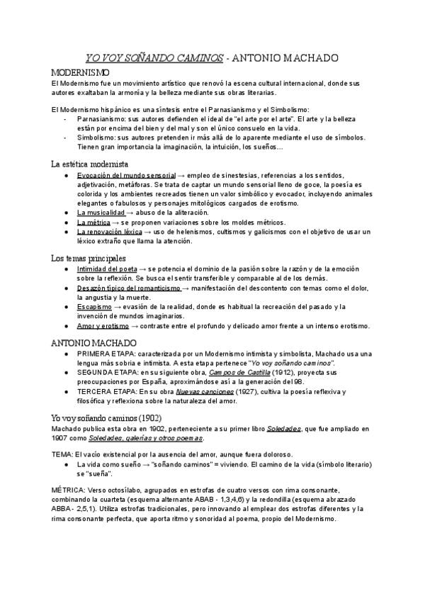 Modernismo, etapas de Antonio Machado, y contexto, tema, métrica y características de "Yo voy soñando caminos".